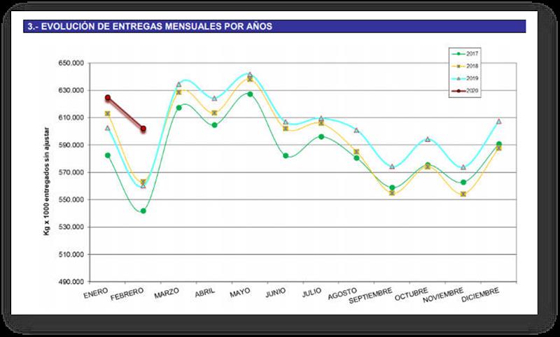 ESPAÑA: fuerte incremento de la producción en febrero 2/4/2020Las entregas de leche en España en febrero han registrado una fuerte suba. Se han incrementado en un 7,7% con respecto a febrero de 2019. En los últimos 11 meses, las entregas han crecido continuamente, pero siempre en menores proporciones. En los últimos meses, aumentaron en torno a un 3,5-3,7%. Por tanto, en febrero, el aumento porcentual ha sido más del doble que en meses anteriores. En febrero, las entregas de leche alcanzaron la cifra de 603.495 ton. (unos 600 millones de litros) de acuerdo con los últimos datos del FEGA. En febrero han entregado leche 12.686 productores, por lo que han desaparecido 66 productores en un mes (tasa anualizada de cese del 6% en línea con los últimos 10 años). En cuanto a precios, la leche en febrero se pagó a 33,6 cent. Euro/litro (US$ 0,365/litro), que es el mismo precio de enero y 0,6 centavos de Euro/litro más alto que hace un año. ![]() Agrodigital