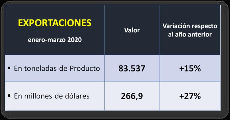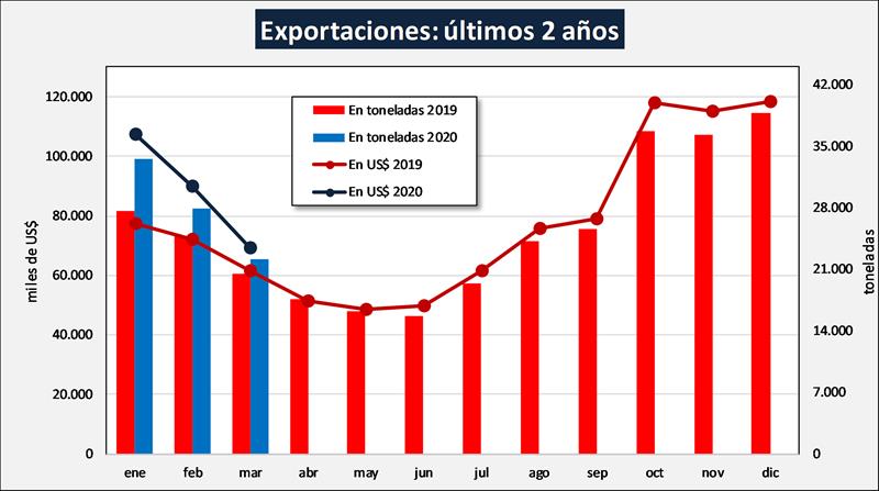 Las exportaciones del mes de marzo de 2020, subieron un 7,8% en volumen de producto y 12,7% en monto total en dólares respecto al mismo mes del año 2019. Respecto al último mes del año anterior (diciembre 2019) donde alcanzaron el pico de ese año, las exportaciones vienen cayendo fuertemente llegando en marzo último a estar -42,9% en volumen y -41.3,2% en valor. Como puede verse en el cuadro superior, el acumulado trimestral es mayor en un 15% en volumen y 27% en valor, respecto a igual período del año anterior.