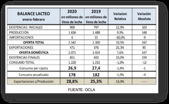 En marzo la producción nacional fue de 793,7 millones de litros, lo que en promedio diario, la ubica un 3,7% por debajo del mes previo y 6,5% por encima de marzo de 2019. En el 1° trimestre, la curva del 2020 acumula 8,8% por sobre el 2019 (que tuvo un mal arranque). Es difícil aún proyectar cómo cerrará el año, porque si bien las condiciones de producción son buenas, la fuerte influencia de la “macro” local y la pandemia del Covid-19, generan mucha incertidumbre. Aún así, el OCLA e industrias que reúnen el 60% de la leche producida, estiman un crecimiento de 4,0%.