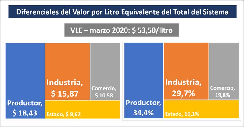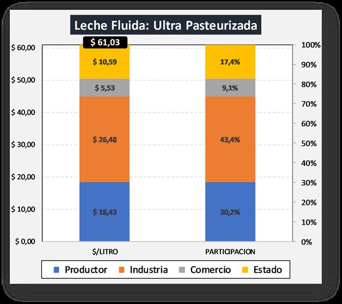 Sobre un valor por litro de leche equivalente final al consumidor de $ 61,03 para marzo del 2020 (litro de leche ultra pasteurizada y los subproductos derivados de la estandarización) el productor participa con el 30,2%.