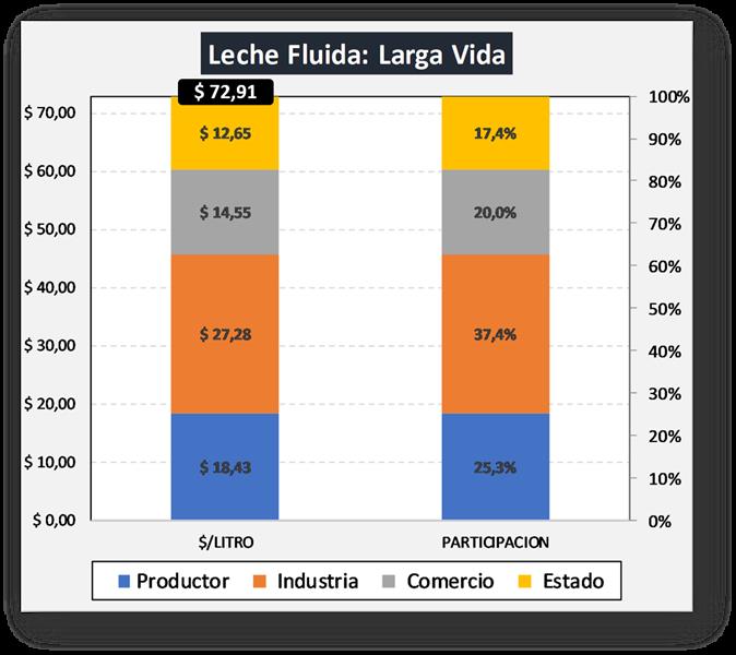 Sobre un valor por litro de leche equivalente final al consumidor de $ 72,91 para marzo del 2020 (litro de leche larga vida y los subproductos derivados de la estandarización) el productor participa con el 25,3%.