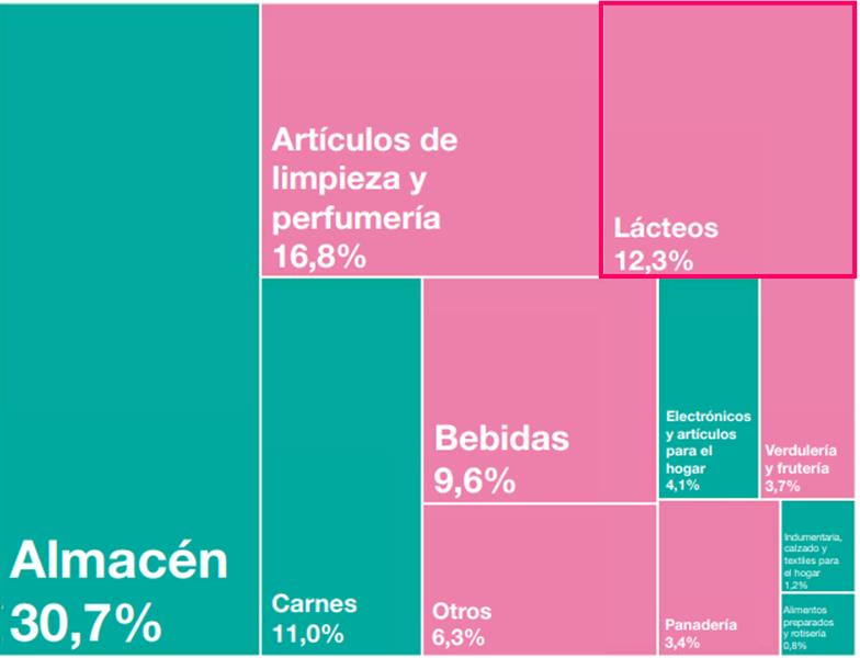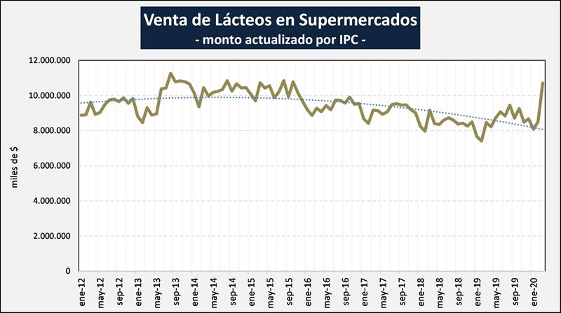 Venta de Lácteos en Supermercados 26/5/2020Ventas totales a precios corrientes y a precios constantes Las ventas a precios corrientes para marzo de 2020 relevadas en la Encuesta de Supermercados sumaron un total de 86.773,4 millones de pesos, lo que representa un incremento de 69,7% respecto al mismo mes del año anterior. Las ventas a precios constantes de diciembre de 2016, durante marzo de 2020, sumaron un total de 27.307,2 millones de pesos, lo que representa un aumento de 10,7% respecto a marzo de 2019. Los Lácteos en Supermercados: Respecto a las ventas de lácteos en los supermercados según los datos de INDEC, fueron de $ 10.706,4 millones para el mes de marzo del 2020, lo que representa un aumento del 21,7% en el promedio diario respecto al mes anterior y un incremento del 87,7% más que marzo de 2019 (la inflación-IPC fue del 3,3% y 48,4%, respecto al mes anterior y anual, respectivamente). Como puede observarse en el gráfico siguiente la participación de los lácteos en la venta de los supermercados, incidió en un 12,3% de sus ventas totales, 1,2 puntos porcentuales más de participación que igual mes del año anterior. Este porcentaje de participación actual está también 1,2 por encima de la media de igual mes de los 8 años anteriores (11,1%). ![]() La distribución de esas ventas en el territorio nacional se pueden visualizar en el gráfico siguiente, donde es de remarcar que la provincia de Buenos Aires (incluyendo a CABA por cuestiones geográficas) representa el 58,4% de las ventas de lácteos en supermercados de todo el país y si agregamos Córdoba y Santa Fe, se concentra en esta región, casi tres cuartas partes de las ventas totales. ![]() Si vemos la evolución de las ventas de lácteos en supermercados, actualizadas por el índice de precios al consumidor (IPC), podemos observar una tendencia decreciente desde 2016 hasta inicios de 2019, y luego una recuperación con su variación estacional y en marzo último se dio una explosión de ventas, producto de las compras de pánico originadas por la cuarentena. ![]() elaborado por el OCLA con datos del Informe de INDEC