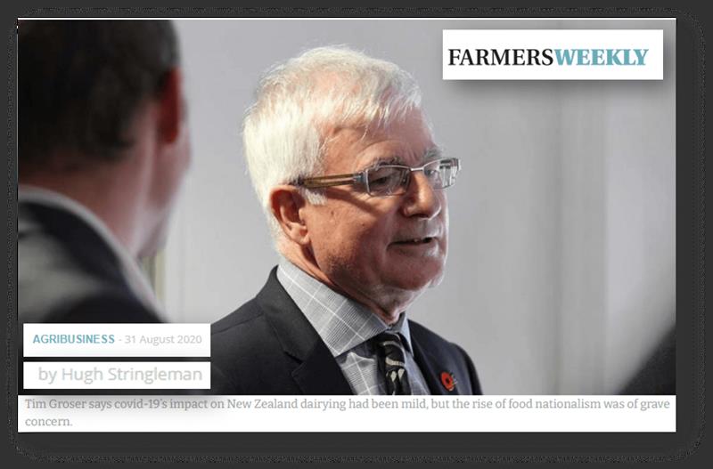 Groser dijo que el impacto de covid en la lechería de Nueva Zelanda había sido leve, incluso positivo en algunos aspectos. Sin embargo, el auge del nacionalismo alimentario fue motivo de gran preocupación porque Nueva Zelanda exportó de forma abrumadora su producción de alimentos.