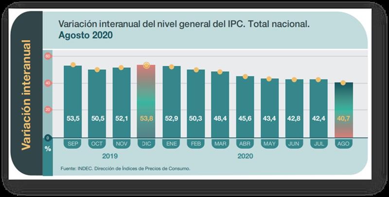 El nivel general del Índice de precios al consumidor (IPC) representativo del total de hogares del país registró en agosto una variación de 2,7% con relación al mes anterior y el acumulado anual fue del 40,7%.