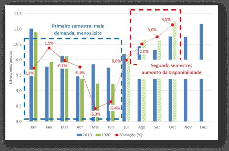 Los mayores precios internos también revirtieron la competitividad de las importaciones, que comenzaron a crecer con fuerza en volumen a partir de julio. En efecto, entre julio y septiembre de 2020, el volumen de importaciones (en equivalente de leche) creció un 65% en relación al mismo período de 2019 (en el primer semestre de este año la caída fue de 36% en el volumen importado) - este efecto, aún sin considerar un crecimiento de la producción en el período (que debió haber ocurrido, debido a la mejora en el RMCR), aumentó la disponibilidad de leche per cápita con relación a 2019 (esta disponibilidad fue menor que en 2019 durante el primer semestre del año, lo que, junto con el crecimiento de la demanda, provocó que los precios subieran bruscamente, como se observa en el mercado); Para ver estos dos efectos del cambio de disponibilidad per cápita en comparación con 2019, consulte el gráfico 2.