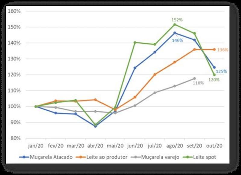 Dado este mercado de la “nueva cara de la moneda” en la segunda mitad, lo que empezamos a ver fue una caída en los precios pagados por los supermercados a la industria y por la leche al contado; hasta el pago de octubre (para la leche suministrada en septiembre), el precio al productor se mantuvo estable. El gráfico 4 muestra un índice de precios (precios de enero / 2020 = 100%) para la mozzarella al por mayor (precios de la industria a los minoristas), al por menor (al consumidor final), la leche al productor y la leche al contado (comercializada cada dos semanas) entre empresas) - la evolución de los índices da una buena idea de lo que ha estado sucediendo y lo que puede suceder a corto plazo con los precios de mercado.