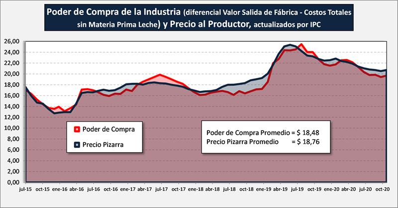 Viendo el precio pizarra liquidado y comparado con la capacidad de pago promedio de la industria, actualizada por IPC, para un período más prolongado, puede observarse que en el largo plazo (salvo oscilaciones temporales) los valores promedio convergen: $ 18,76 por litro de Precio Pizarra y $ 18,48 por litro de Poder de Compra.