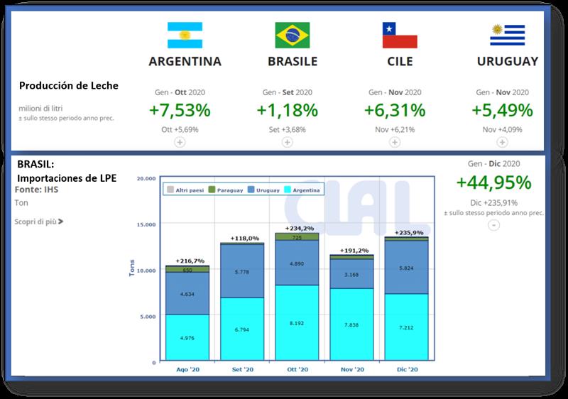 También en Brasil, para el período enero - septiembre las entregas de leche están aumentando, en un +1,2% en comparación con el mismo período de 2019. Sin embargo, en la industria láctea brasileña los volúmenes de leche no son suficientes para satisfacer las necesidades de las empresas transformadoras.