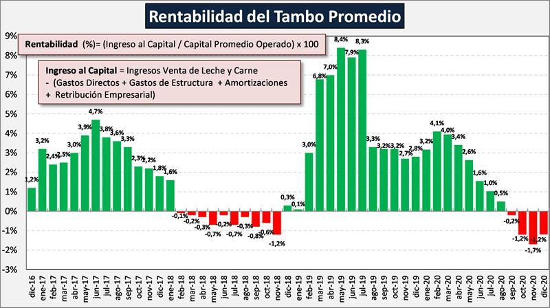 El gráfico anterior al comparar el Ingreso al Capital generado por el Caso Modal Promedio Ponderado con el Capital Promedio Operado (tierra, animales, maquinarias, bienes de uso y circulante), da una tasa de rentabilidad del -1,2%. La rentabilidad ponderada de las diez regiones por estrato fue de -1,9%, -1,2% y -0,7% para el tambo chico, mediano y grande, respectivamente.