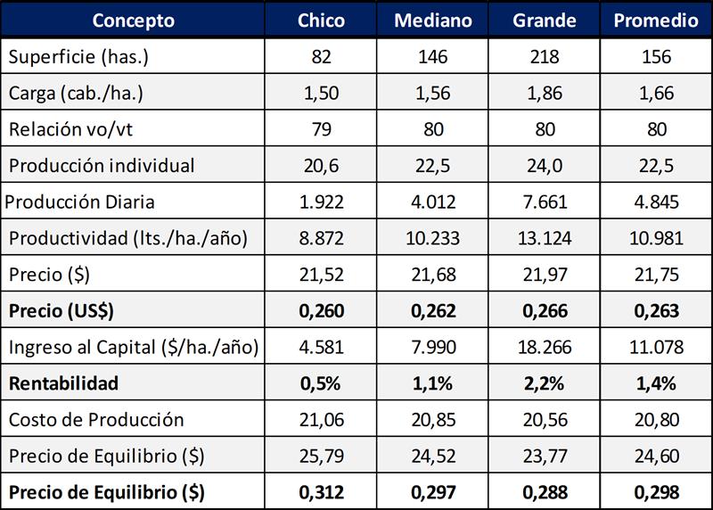 Si suponemos una tasa de rentabilidad exigida al capital del 5%, se debería generar un Ingreso Neto por hectárea que dividido por los 7.950 litros de leche de productividad promedio, deberían generar un valor de costo de oportunidad al capital promedio operado de $ 4,28/litro de leche. Por lo tanto, el Precio de Equilibrio sería en este supuesto de $ 27,12/litro de leche ($ 22,84 de Costo Total + $ 4,28 de Rentabilidad al Capital), unos US$ 0,328/litro.