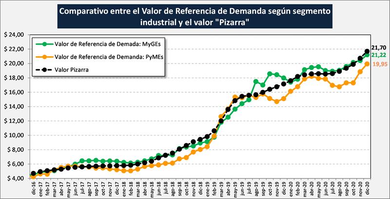 Se observa en el gráfico una mayor capacidad de pago en el mes de diciembre/20 del segmento de MyGEs que del segmento PyMEs, $ 21,22 y $ 19,95, respectivamente. Pero en ambos casos esa capacidad de pago es inferior al precio real pagado ($ 0,48 en la grandes empresas y $ 1,75 para la pequeñas y medianas).