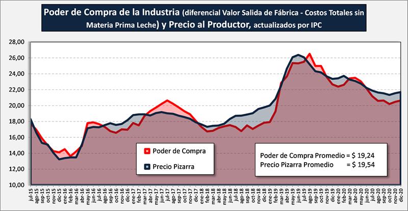Viendo el precio pizarra liquidado y comparado con la capacidad de pago promedio de la industria, actualizada por IPC, para un período más prolongado, puede observarse que en el largo plazo (salvo oscilaciones temporales) los valores promedio convergen: $ 19,54 por litro de Precio Pizarra y $ 19,24 por litro de Poder de Compra.