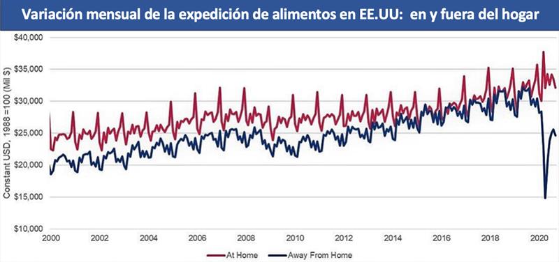 Recuperación del servicio de alimentos: la guía principal a tener en cuenta es si continúan las ayudas y si los estadounidenses vuelven a salir a cenar, con el avance de la vacunación. De marzo a octubre de 2020 en comparación con 2019, el gasto total en alimentos fuera del hogar cayó un 26%, y se estima que el 17% de los restaurantes han cerrado de forma permanente. Aún así, al menos para los lácteos, la combinación de compras minoristas y gubernamentales ha sido suficiente para mantener la demanda.