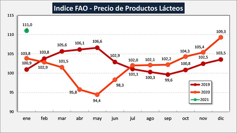 El índice de precios de los productos lácteos de la FAO registró un promedio de 111,0 puntos en enero, esto es, un alza de 1,7 puntos (un 1,6 %) desde diciembre de 2020, lo cual hizo de este el octavo mes consecutivo de aumento y situó al índice 7,1 puntos (un 6,9 %) por encima del valor registrado en el mismo mes del año pasado. En enero, aumentaron las cotizaciones de la mantequilla y de la leche entera en polvo, sustentados por las importantes compras por parte de China, con motivo de las próximas festividades de Año Nuevo en el país, en un contexto de reducción estacional de los suministros para la exportación en Nueva Zelandia. Subieron asimismo las cotizaciones de la leche desnatada en polvo ante la presión ejercida por la gran demanda de importación de suministros al contado y las escasas actividades de producción en Europa occidental. Por el contrario, los precios del queso disminuyeron ligeramente desde los niveles máximos registrados en diciembre de 2020, debido a las limitadas ventas internas en Europa unidas a la acumulación de existencias en los Estados Unidos de América.