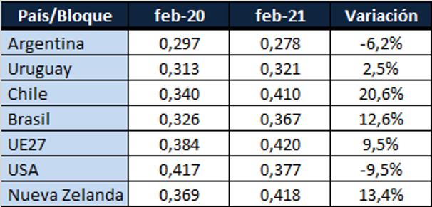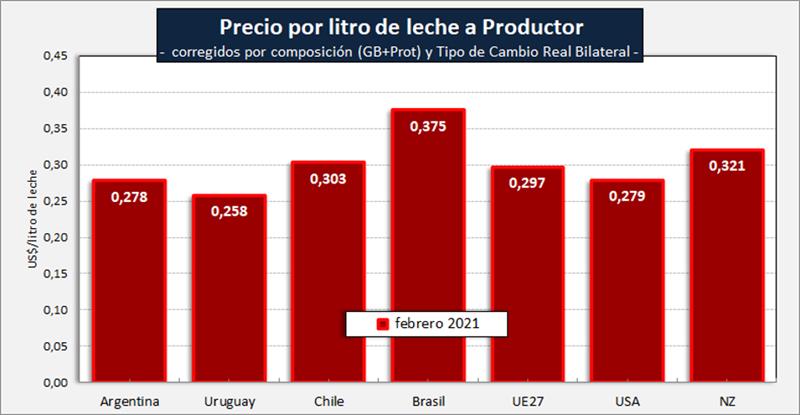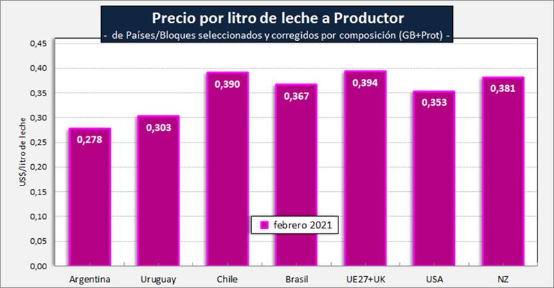 Observaciones: los precios en el gráfico de arriba han sido corregidos sólo por sólidos útiles (grasa butirosa y proteína) y no por el resto de componentes que hacen a la calidad higiénica y sanitaria, ni tampoco por tipo de cambio real bilateral con cada uno de esos países/bloques.
