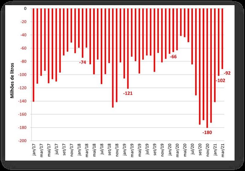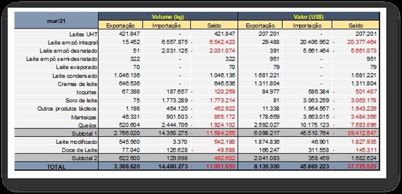 Según datos difundidos por la Secretaría de Comercio Exterior (SECEX), el saldo de la balanza comercial de productos lácteos fue de -92 millones de litros en equivalente de leche en marzo, una disminución del 10% en comparación con feb/21 (es decir, el saldo fue "menos negativo").