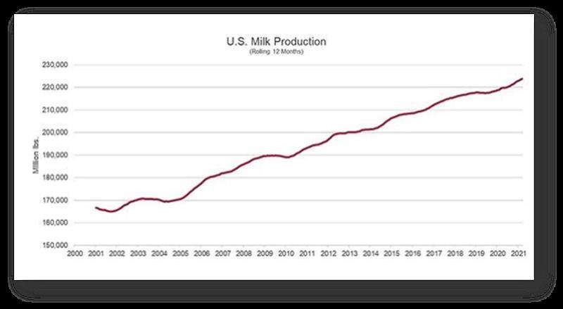 Los productores de leche de EE. UU. son los mejores en lo que hacen. Para confirmar eso, solo tiene que ver el crecimiento en la producción de leche de EE. UU. durante las últimas décadas: + 15%, o 1,4% por año en promedio, desde 2000.