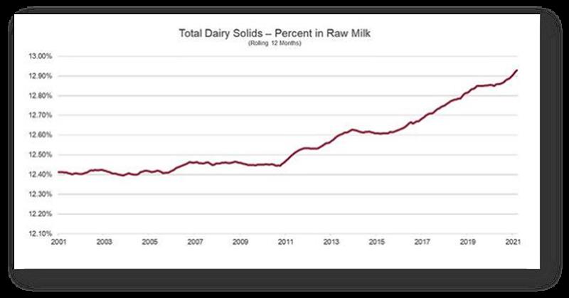 Ese aumento ha sido tan constante en parte porque cada año la producción de leche por vaca ha aumentado, ya que los productores han adoptado prácticas innovadoras en tecnología, nutrición, genética y cuidado de los animales. De hecho, el aumento de la productividad ni siquiera se limita a más leche líquida por vaca. Cada quintal de leche contiene más grasa láctea, proteínas y lactosa, o sólidos lácteos que se utilizan para crear los productos que disfrutan los consumidores de todo el mundo.