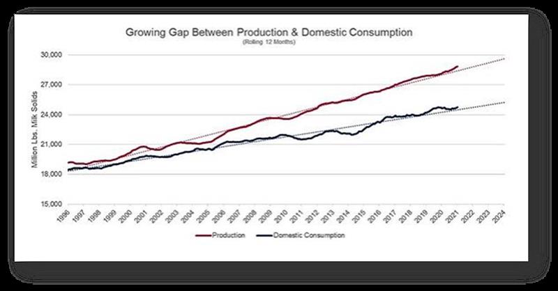 Como se mostró claramente arriba, muchos productores de leche de todos los tamaños de EE. UU. han demostrado un deseo de hacer crecer sus operaciones lecheras, ya sea a través de más vacas, ganancias de eficiencia o, a menudo, ambas. En la sección anterior, mencionamos cómo esto ha creado una brecha entre la producción y el consumo interno en la actualidad. Pero a medida que miramos hacia el mañana, el mercado internacional se volverá cada vez más importante para permitir que los productores de leche de EE. UU., de todos los tamaños y regiones sigan creciendo.