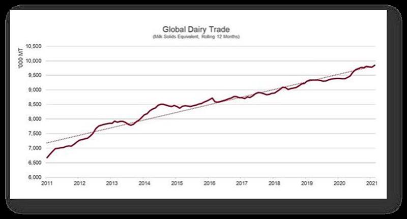 Durante los últimos 10 años, el comercio mundial de productos lácteos creció en promedio un 3,8% anual sobre una base equivalente de sólidos lácteos. ¡Ese aumento es el equivalente a más de 7 mil millones de libras de sólidos lácteos o 54 mil millones de libras de leche líquida! Incluso una pandemia mundial no logró frenar el apetito de los consumidores internacionales por los productos lácteos, ya que el comercio mundial de productos lácteos se expandió un 3,9% en 2020, ajustando el día bisiesto.