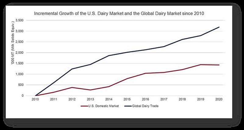 De cara al futuro, esperamos que la demanda mundial de lácteos continúe su expansión a largo plazo gracias a que el 96 por ciento de la población mundial vive fuera de los EE. UU. y esa población mundial experimenta un aumento de los ingresos y un creciente apetito por los lácteos. Aprovechar la oportunidad de aumentar la participación en el mercado internacional en expansión permitirá a los productores de leche de EE. UU. Crecer a un ritmo más rápido que si los EE. UU. Dependieran únicamente del mercado nacional.