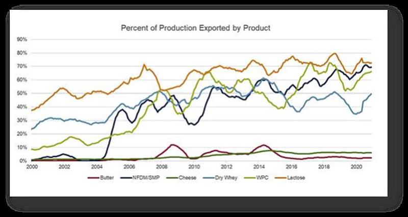 Si bien no ignoramos el mercado interno de EE. UU. y su importancia, las exportaciones se están convirtiendo cada vez más en el principal motor de crecimiento. Desde 2003, más de la mitad de toda la leche adicional producida por los productores estadounidenses se ha destinado a las exportaciones. Y esa cifra está creciendo: un asombroso 75% de la "nueva leche" producida en 2020 se fue al extranjero. Esencialmente, el mercado internacional es crucial para permitir el crecimiento de la producción de leche en los EE. UU.