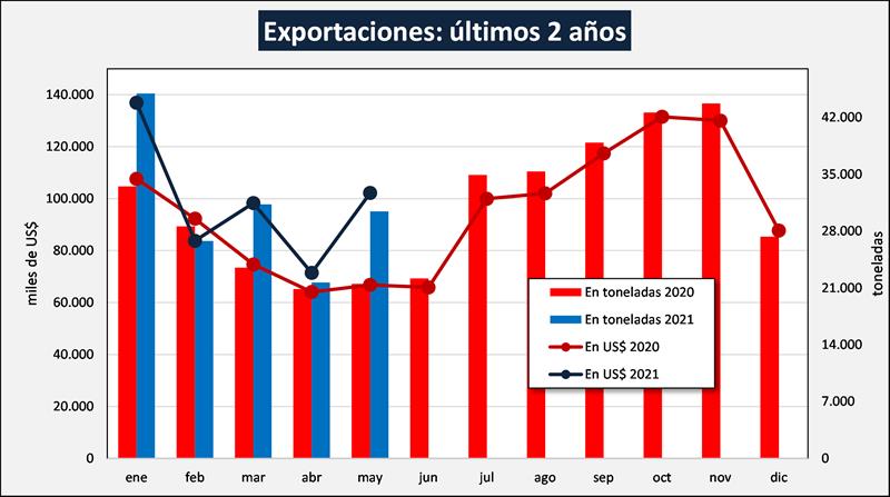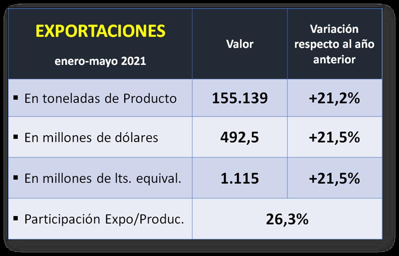 La variación intermensual de las exportaciones fue de +40,5% en volumen y de +43,0% en valor (may/21 vs. abr/21). La variación interanual de mayo 2021 fue de +41,06% en volumen y +53,0% en valor (may/21 vs. may/20).