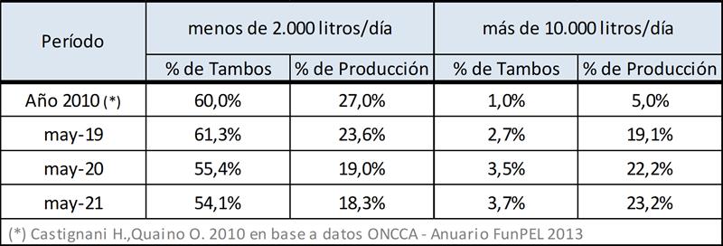 Puede verse que en los meses de mayo de los últimos tres años (2019-2021), y también comparado con datos disponibles del año 2010, que en un extremo disminuye la participación tanto en cantidad de tambos como en el volumen de producción de las unidades productivas de menos de 2.000 litros diarios y en el otro extremo de la estratificación, se incrementa la participación de las unidades de más de 10.000 litros diarios.