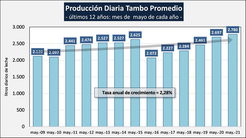 Sobre la base de la producción mensual y la cantidad anual de tambos (SENASA), podemos inferir el tamaño del tambo promedio, unos 2.780 litros de leche diarios para mayo del 2021, un 3,1% más que el año anterior. Si evaluamos su comportamiento en el tiempo, a pesar de la disminución en el número de unidades productivas y en el número de vacas, el tambo promedio presenta en el período 2009-2021 una tasa de crecimiento acumulada anual del 2,28% lo que permite, a pesar de la reducción en las unidades productivas y en el rodeo, el sostenimiento de los niveles productivos agregados a nivel país.