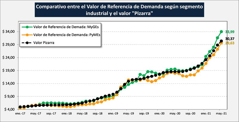 En el gráfico de abajo se subdivide la capacidad de pago o valor de referencia de demanda, entre las denominadas Megas y Grandes Empresas (MyGEs) y Pequeñas y Medianas Empresas (PyMEs).