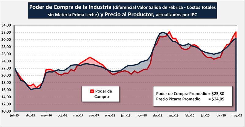 Viendo el precio pizarra liquidado y comparado con la capacidad de pago promedio de la industria, actualizada por IPC, para un período más prolongado, puede observarse que en el largo plazo (salvo oscilaciones temporales) los valores promedio convergen: $ 24,09 por litro de Precio Pizarra y $ 23,80 por litro de Poder de Compra.