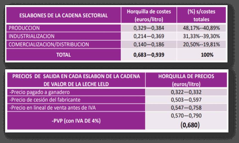 El estudio recoge los costos de producción de cada uno de los eslabones, como puede verse en las tablas adjuntas. En el caso del sector productor, se determinan unos costos medios entre 32,9 y 38,4 céntimos/litro. Los costos totales al final de la cadena son entre 68,3-93,9 céntimos/litro.