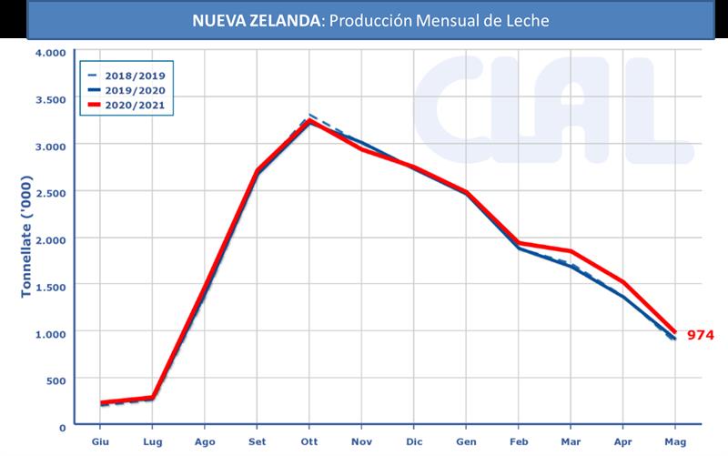 Con un aumento del + 7,6% en mayo de 2021, la temporada de producción en Nueva Zelanda finalizó con un + 2,6%. Estos resultados positivos se deben probablemente a la fuerte contribución de la alimentación complementaria.