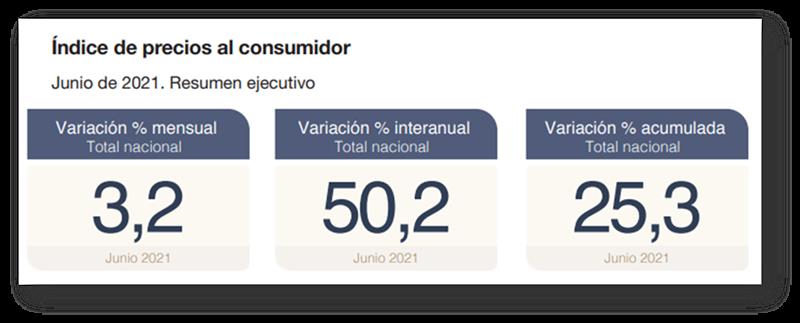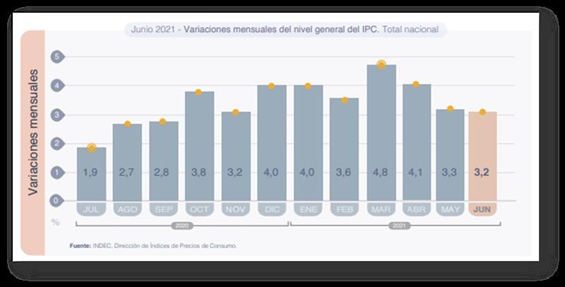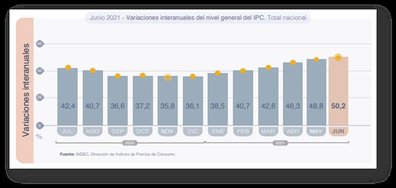 El nivel general del Índice de precios al consumidor (IPC) representativo del total de hogares del país registró en junio una variación de 3,2% con relación al mes anterior, del 25,3% en el primer semestre del año y del 50,2% en el interanual.