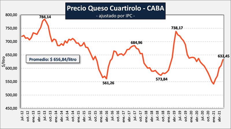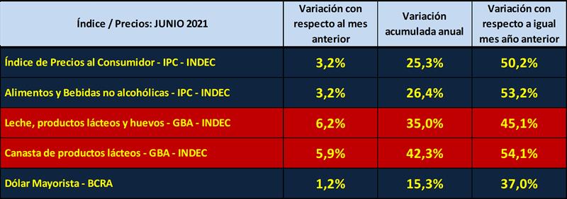 Como se indica más arriba en función de diferentes índices, los precios de los productos lácteos tuvieron una variación interanual entre 45,0/50,0%, cuando la inflación minorista fue de 50,2%, los alimentos y bebidas no alcohólicas aumentaron un 53,2% en el año y el dólar oficial BCRA tuvo una variación interanual del 37,0%, lo que indica que los últimos ajustes de precios acercan los valores del mix de productos lácteos de mercado interno a las variables mencionadas, salvo respecto al insumo principal, la leche cruda, que experimentó un aumento interanual del 71,6% (precio SIGLeA por litro).