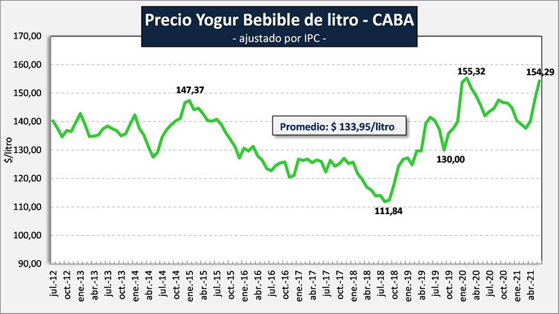 La situación de los yogures bebibles de litro es diferente, sostienen el nivel de consumo de la categoría, sus precios se ajustaron durante 2020 con el ritmo inflacionario, pero lamentablemente tiran para abajo el promedio del mix, ya que su aumento de ventas no fue acompañado por las ventas de yogures en pote, postres y flanes que tienen un mayor valor por litro equivalente.