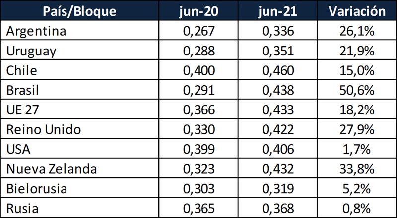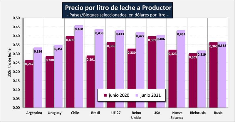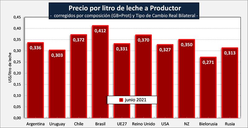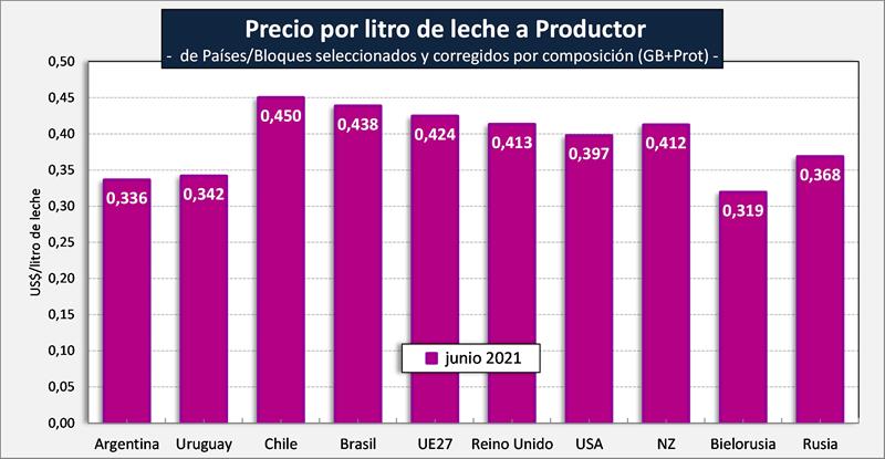 Observaciones: los precios en el gráfico de arriba han sido corregidos sólo por sólidos útiles (grasa butirosa y proteína) y no por el resto de componentes que hacen a la calidad higiénica y sanitaria, ni tampoco por tipo de cambio real bilateral con cada uno de esos países/bloques.
