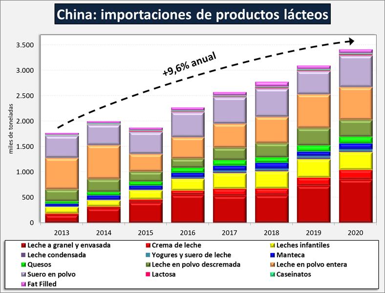 De igual forma, China es por lejos el principal importador de manteca, butteroil, leche en polvo entera y descremada, como así también de suero de queso con destino a consumo animal. Aún no tiene una importación tan alta de quesos debido a que sus hábitos de consumo, aunque se están occidentalizando día a día, todavía no se da un gran consumo.
