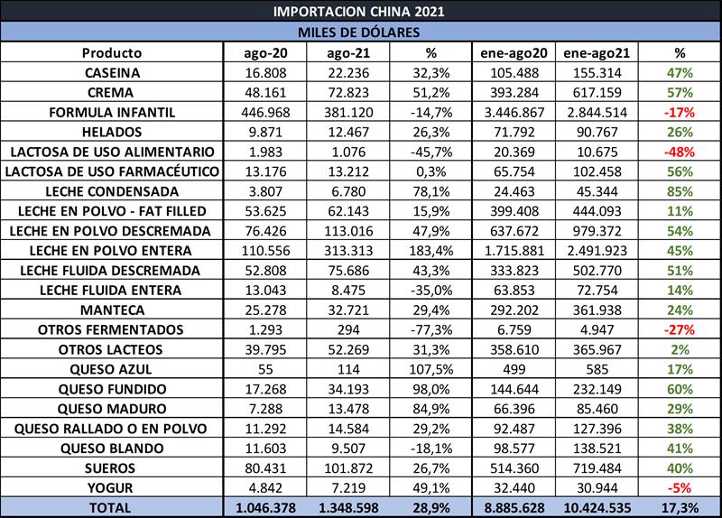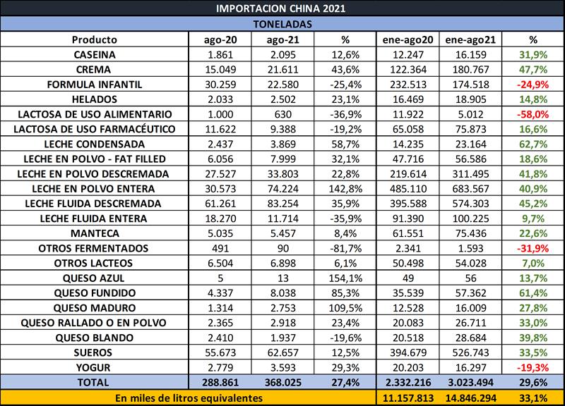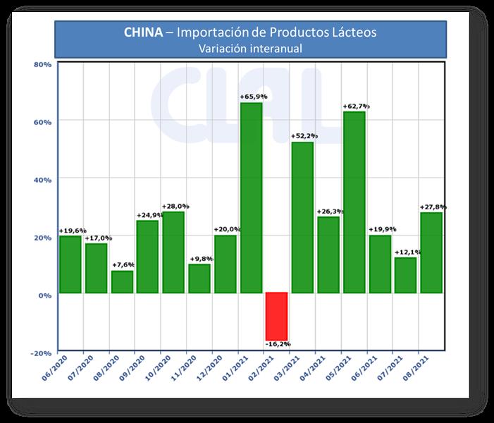 En los 8 meses transcurridos del 2021 las importaciones de productos lácteos de China, crecieron el 29,6% en volumen de productos, y equivalen a unos 14.850 millones de litros leche, +33,1% que igual período del año pasado. Con ese volumen de importaciones, China representa alrededor del 25% del comercio mundial de lácteos (excluyendo las operaciones intra Unión Europea).