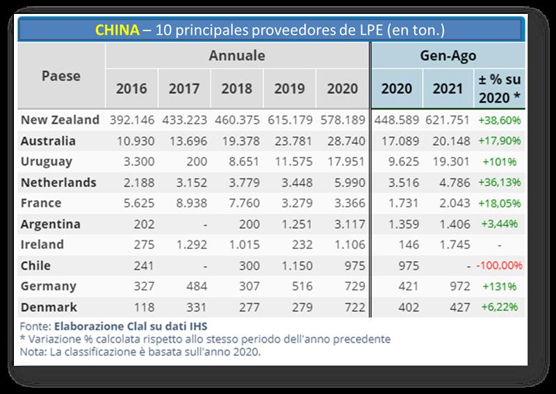 China es el principal importador de Leche en Polvo Entera y su principal proveedor es Nueva Zelanda quien ostenta el 91% de participación de ese producto en el gigante asiático, en el período enero-agosto del 2021.