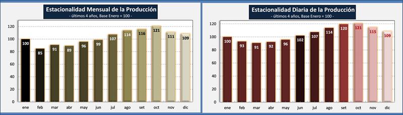Como es habitual, la producción desde el pico de máxima en octubre, cae a una tasa del 5% mensual hasta marzo/abril (tomando el promedio diario de producción, para que no afecten la cantidad de días de cada mes), donde luego comienza un nuevo repunte hacia octubre.