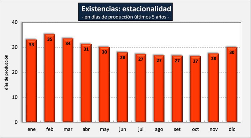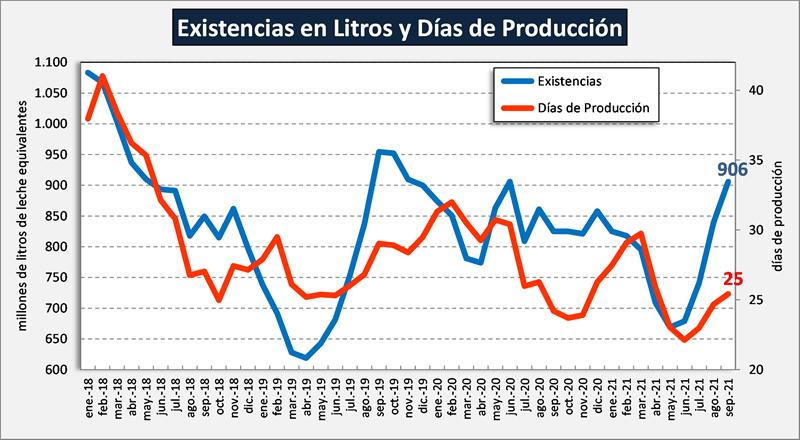 A pesar que las existencias en litros de leche equivalentes son mayores a períodos anteriores, debido al importante crecimiento de la producción de los últimos dos años, en días de producción, están en 25 días cuando la media es de 27 días.