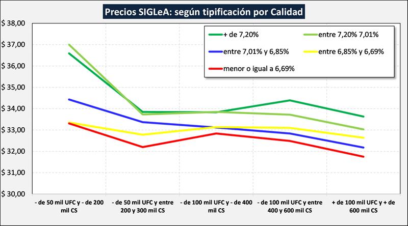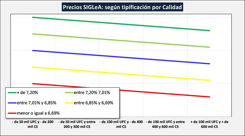 En el cuadro de tipificación, la leche comercializada se divide en 25 estratos según composición y calidad higiénico-sanitaria y, dentro de cada estrato, se muestra un promedio ponderado del precio del total de esos litros y además un promedio ponderado del 20% superior e inferior de los precios.