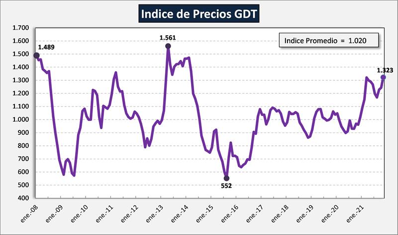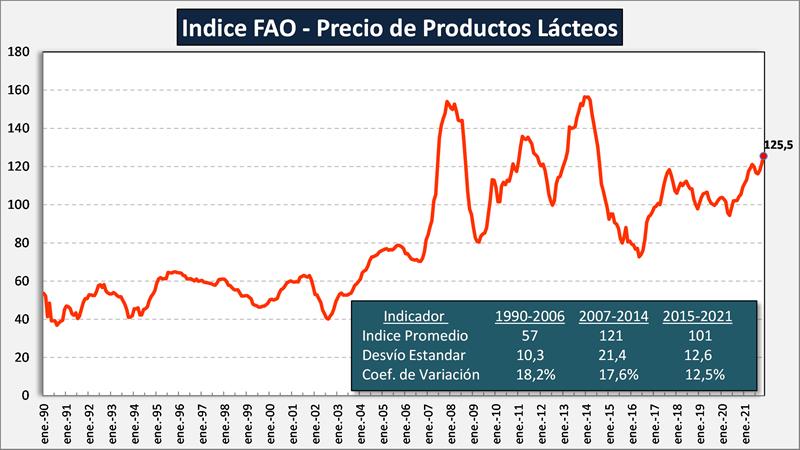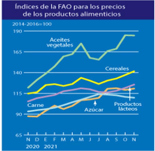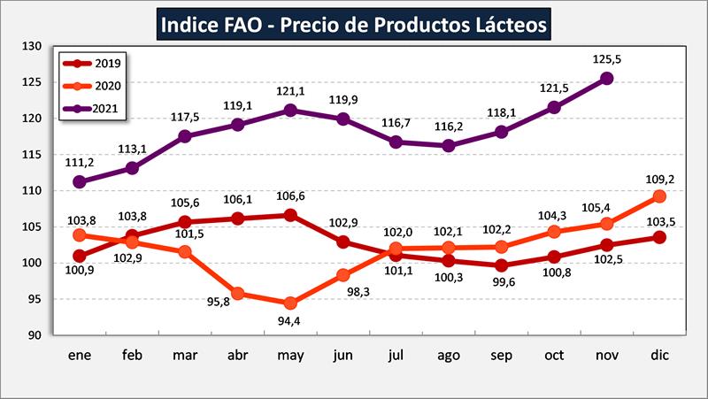Indice de Precios de los Lácteos de FAO 6/12/2021![]() El índice de precios de los productos lácteos de la FAO registró en noviembre un promedio de 125,5 puntos, esto es, 4,1 puntos (un 3,4 %) más que en octubre y 20,2 puntos (un 19,1 %) por encima del nivel registrado en el mismo mes el año pasado. En noviembre, las cotizaciones internacionales de la manteca y las leches en polvo subieron de forma acusada por tercer mes consecutivo, impulsadas por las escasas disponibilidades exportables a escala mundial y el agotamiento de los stocks, debido a la disminución de las entregas de varios de los grandes países productores de leche de Europa occidental, lo cual coincidió con una producción inferior a lo previsto en Oceanía. La fuerte demanda mundial de importaciones se mantuvo como resultado de los esfuerzos de los compradores por obtener suministros al contado en previsión de una contracción de los mercados, lo que añadió una presión alcista adicional sobre los precios, pese a la incertidumbre en los mercados respecto de la demanda a corto plazo provocada por las crecientes restricciones sociales relacionadas con la COVID-19. Las cotizaciones del queso subieron ligeramente, como consecuencia del aumento de la demanda y de las demoras en los envíos que dificultaron las ventas de los proveedores mundiales. ![]() Información complementaria: 1) Índice de Precios del Global Dairy Trade ![]() 2) Índice de Precios de los Productos Alimenticios - FAO ![]() elaborado por el OCLA con información de FAO y del GDT