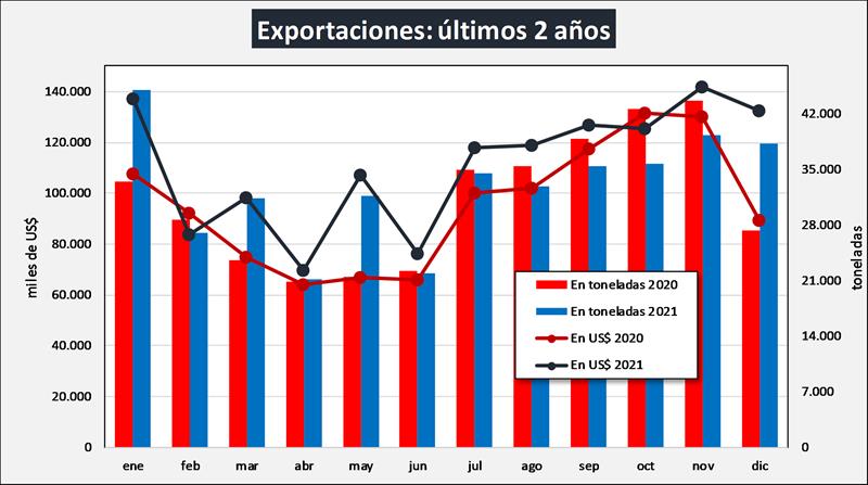 La variación intermensual de las exportaciones fue de -2,6% en volumen y de -6,6% en valor (dic/21 vs. nov/21). La variación interanual de diciembre 2021 fue de +40,2% en volumen y +48,5% en valor (dic/21 vs. dic/20), pero cabe recordar que en diciembre del 2020 las exportaciones fueron bajas productos de dificultades con el comercio con Brasil.