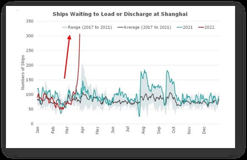 El segundo punto, y quizás el más relevante, es el tema logístico. La ciudad portuaria de Shanghái, uno de los principales puertos del país y el puerto de contenedores más activo del mundo, está sintiendo los efectos de las medidas restrictivas y sus operaciones se ven comprometidas, lo que ejerce presión sobre las cadenas de suministro mundiales. Se observa un alto número de congestiones de barcos en el puerto, lo que retrasa las entregas y dificulta nuevas negociaciones de importación para el país.