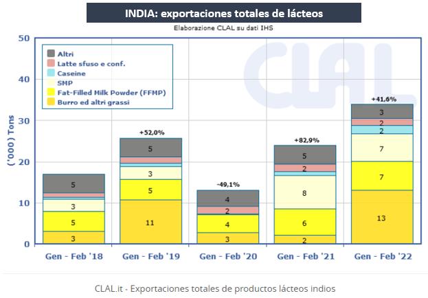 Los datos publicados en India Framework de CLAL.it muestran que en el período enero-febrero de 2022 las exportaciones totales de productos lácteos indios crecieron un 41,6% respecto al mismo período del año anterior, que a su vez creció un 82,9% respecto a enero-febrero de 2020, un período sin embargo frenado por la propagación de Covid, que en India se cobró varias víctimas.