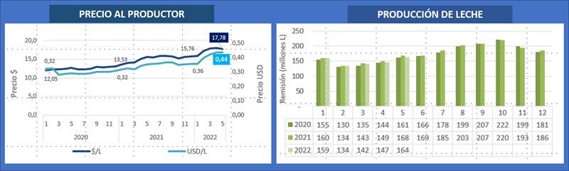 URUGUAY: Producción y Precio 23/6/2022- Precio de la leche en tambo: mayo 2022 creció 23% en dólares respecto a mayo 2021 con un valor de 0,44 dólares por litro.