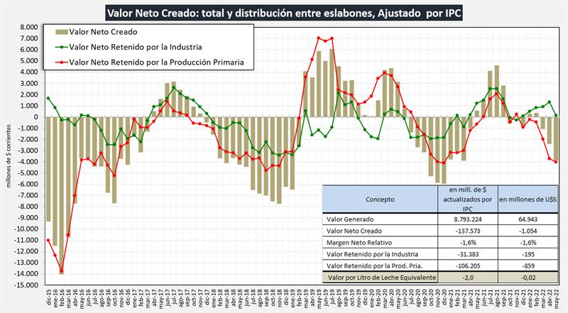 La cadena presenta un resultado negativo en mayo 2022 de $ 3.886 millones (3,7 centavos de dólar por litro de leche equivalente). El sector industrial tiene un resultado estimado positivo de $ 129 millones y quien lleva una pérdida significativa es el sector primario con $ 4.016 millones (unos $ 4,4/litro de leche), lo que indicaría un precio de equilibrio necesario entre $ 50 y $ 51/litro para cubrir todos los costos operativos y el costo de oportunidad del capital.