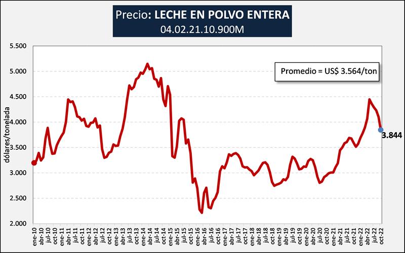 El precio medio de exportación por tonelada fue de US$ 4.068 para los 10 primeros meses del año, lo que implicó un incremento del 21,4% respecto a 2021. En el caso particular del rubro Leches en Polvo, el precio promedio fue de US$ 3.979/ton., un 18,6% por encima del igual período del año anterior.